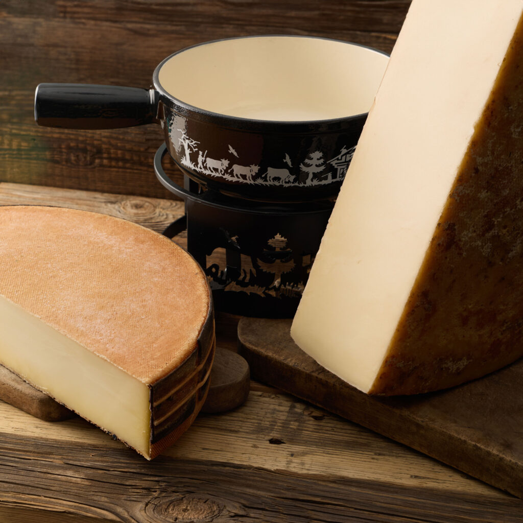 - Vacherin Fribourgeois, affiné au minimum 4 mois par la Fromagerie du Moléson, délicatement sanglé d’une écorce d’épicéa qui lui confère son arôme boisé et sa texture fondante.
